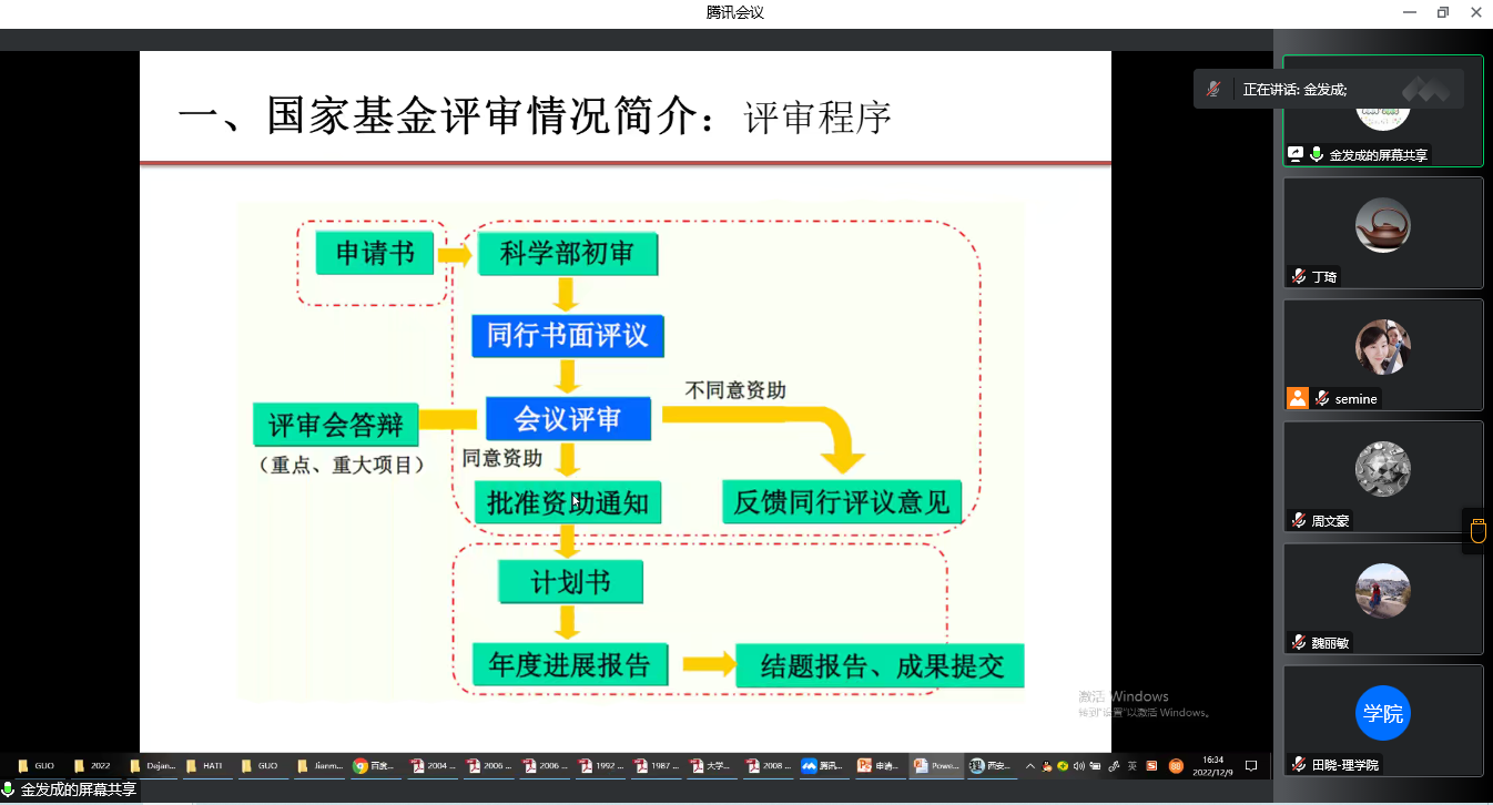 金发成副教授分别从国家基金评审情况、科学问题属性内涵、题目、摘要、立项依据与研究内容、研究基础与工作条件以及评审常见问题等几方面进行了详细阐述,并给大家分享了个人申报基金的经验,与会教师受益颇深。