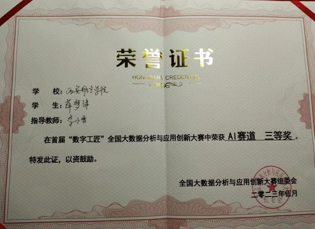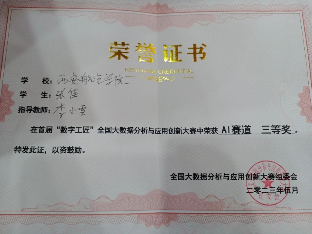 近日,由机械工业经济管理研究院指导,《智慧中国》杂志社、国声智库主办,西安理工大学、美林数据技术股份有限公司承办的首届“数字工匠”全国大数据分析与应用创新大赛总决赛在西安理工大学曲江校区顺利举行,经过激烈角逐,公司李小雪和王苗苗老师指导的信息计算202班薛梦津、张佳2名同学组成的“祺珩”队,荣获AI赛道全国三等奖。