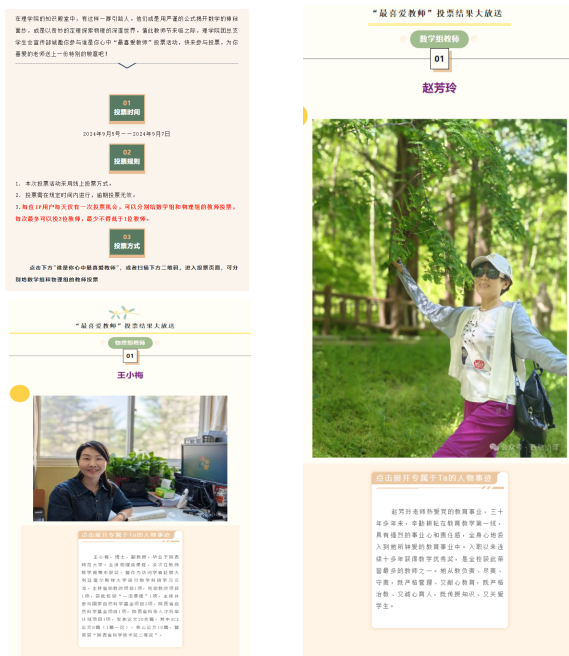 为大力宣传优秀教师典型,教师节期间在员工中开展了“我最喜欢的老师”活动,经网络投票,共评选出赵芳玲、张蒙、任炯、陈国心、王小梅、邬华春、王妙和王臣臣等八名教师,并及时在“西航小理”微信平台推出2期专题进行宣传,号召全体教师学习这八名教师热爱教育、热爱员工的情怀与坚守,唱响尊师重教主旋律。