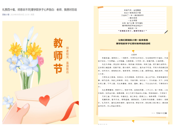 二是开展“礼赞四十载,师恩诉不尽”活动,员工通过微信等方式,以短文、诗词等形式向教师们表达他们最纯真的谢意。