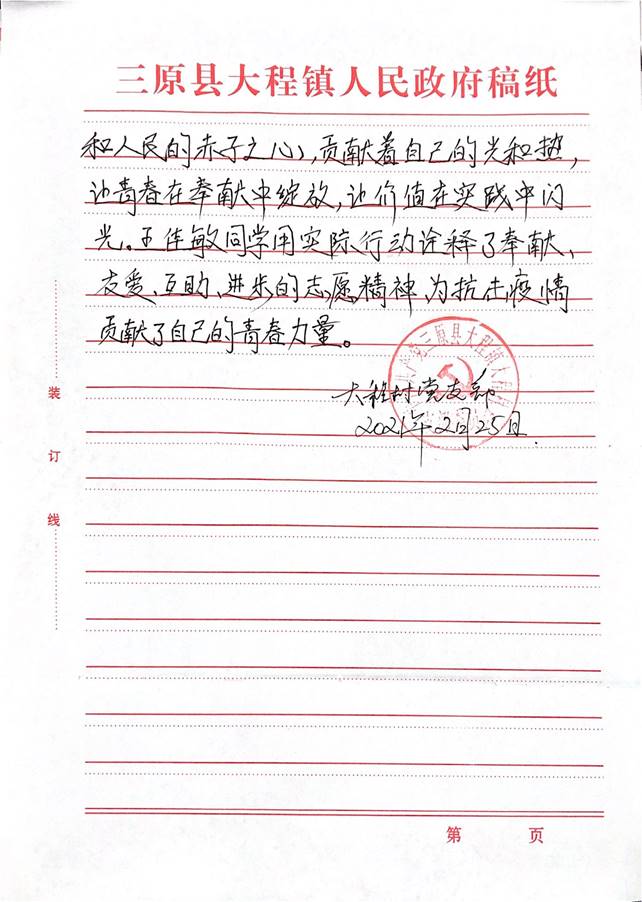 在志愿服务期间,王佳敏同学每天准时在防疫工作点进行值守,宣传疫情防控的知识,提醒出入人员佩戴口罩并为其测量体温,积极地帮助村中的老年人注册陕西安全防疫健康码。王佳敏同学表示,在疫情爆发时,第一时间想的是如何尽自己所能为疫情防控做出一点点贡献,因为这是一名党员该有的责任。