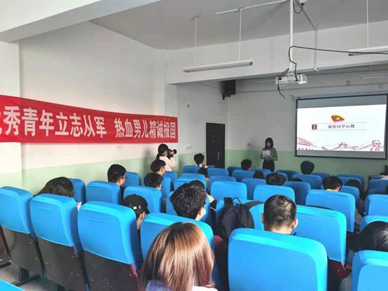 活动伊始,大家集体观看了本年度秋季征兵宣传片;接着信息计算201班退役复学的同学王语婷分享了她在军营生活的经历和她最喜欢的那句话,即电视剧《火蓝刀锋》的主角蒋小鱼所说的“我愿将每一滴热血洒进祖国的大海”,同时,她讲出了退役时候给部队的庄严承诺:若有战,召必回,战必胜,表现出了一名军人对祖国最深切的爱,在场响起了热烈的掌声;随后,信息计算181退役复学的张永航向同学们展示了自己的军营生活,讲解了国家对老员工参军的相关政策,即退役士兵考研会额外加10分,并且在2018年开始实行了军属保障政策,军属军医院看病可以享受几乎全免的政策,在军队中提干关于老员工的一些福利政策等相关内容。