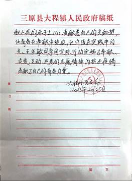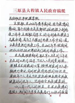 工作内容:春节期间,在村口进行值守,为出入人员测量体温,提醒居民佩戴好口罩,按照规定对进入车辆进行登记,宣传疫情防控的知识,给还没注册陕西安全防疫健康码的老年人,注册安全防疫健康码。积极地落实防疫工作要求。