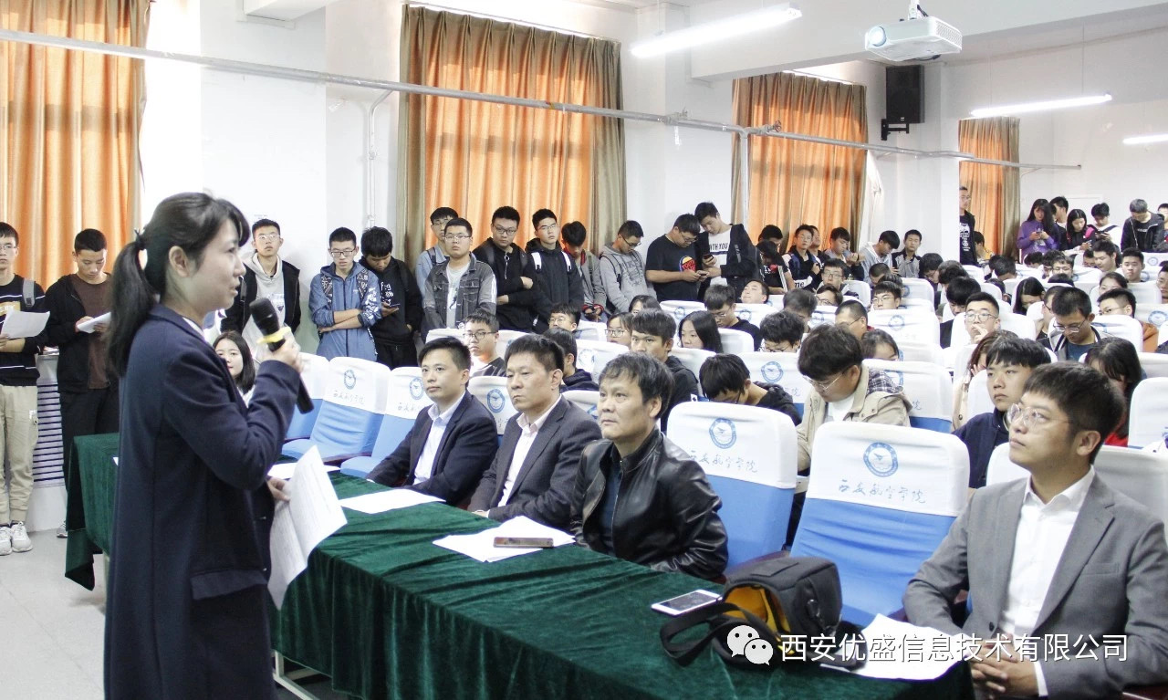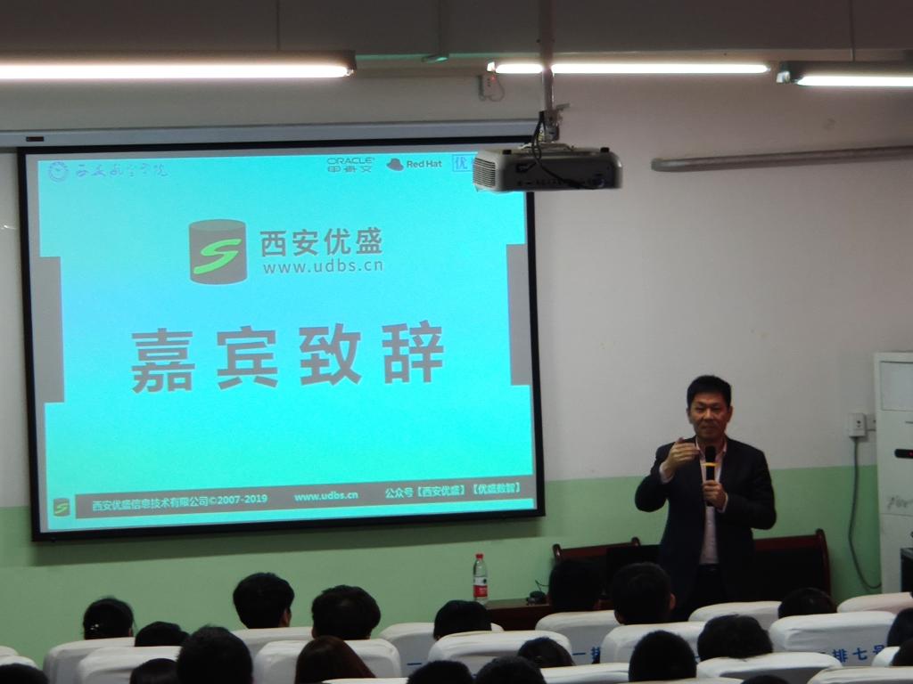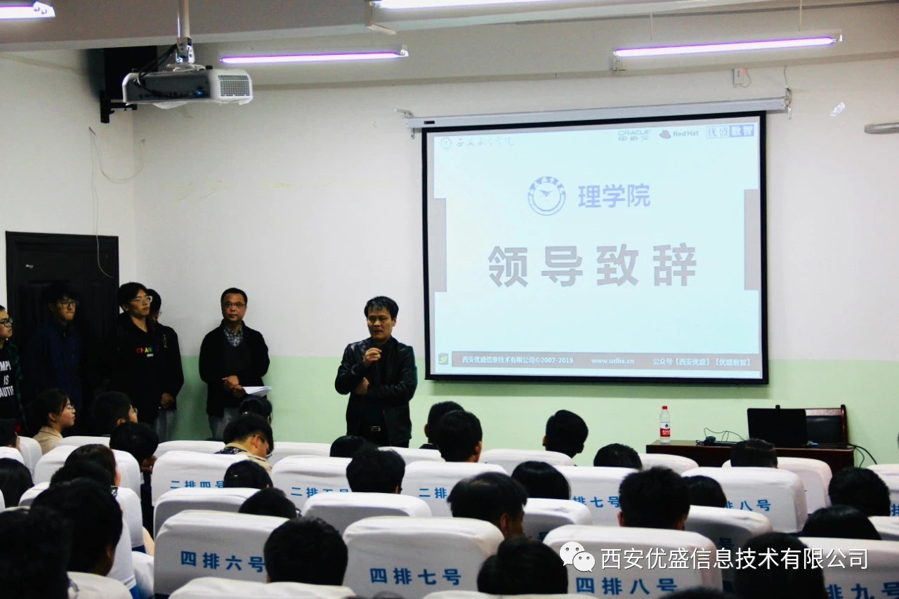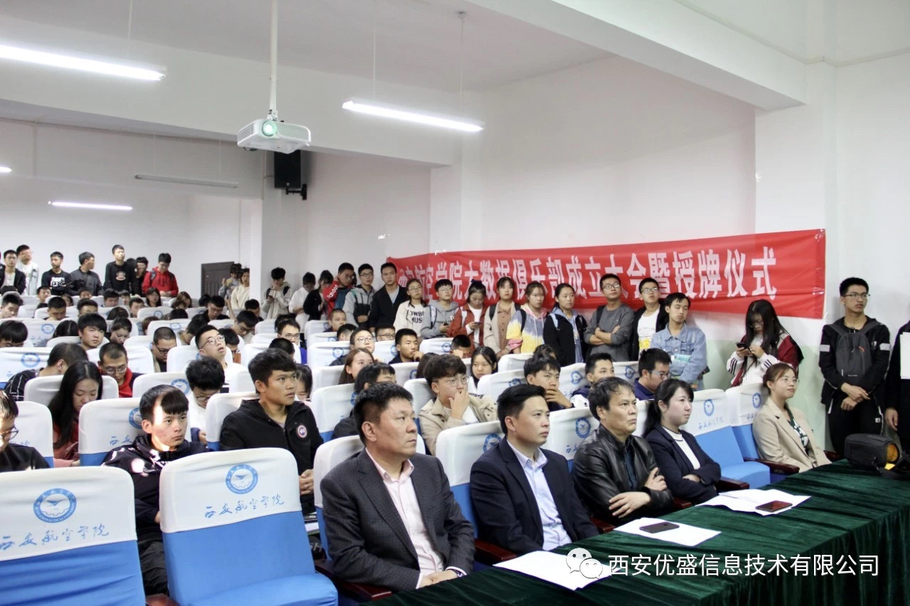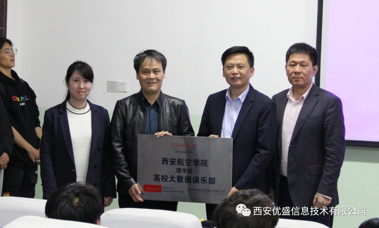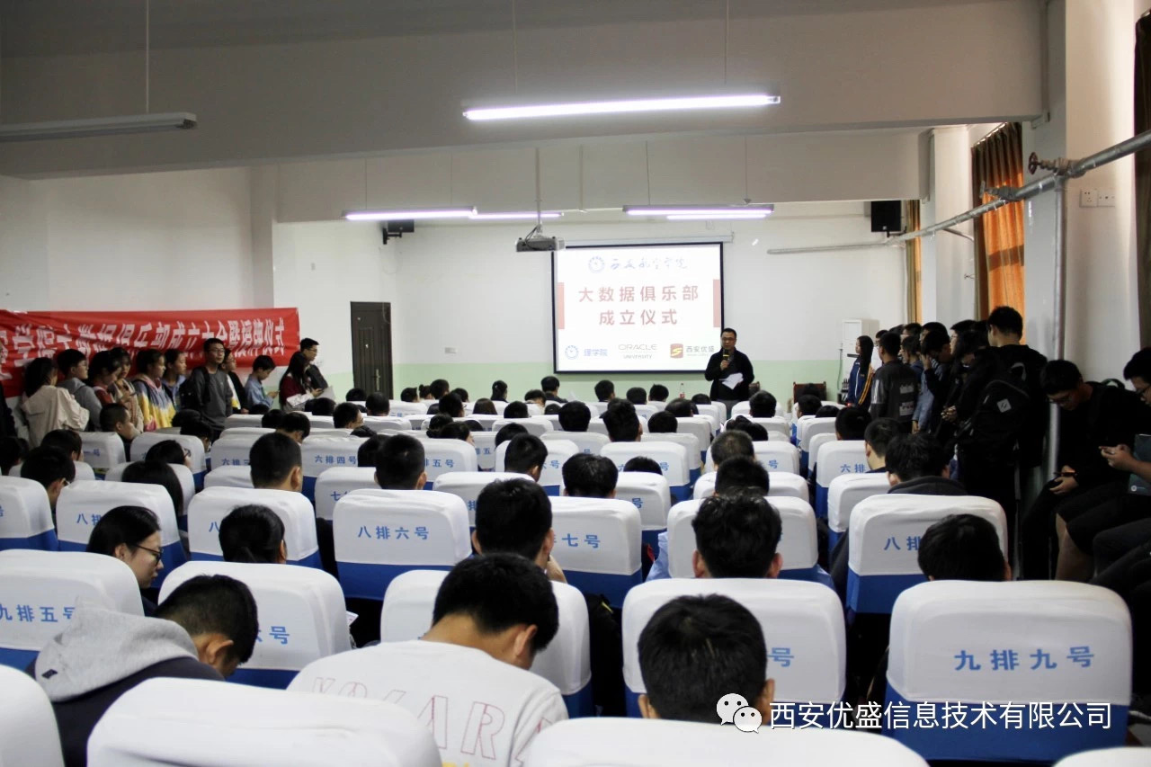 首先由岳忠玉致辞,他介绍了参加本次活动嘉宾,讲解了大数据的发展历程及前景,希望公司能再接再厉,在大数据方面继续引领公司发展;任静向参加授牌仪式的嘉宾、老师和同学表示欢迎。接着,王云清向公司大数据俱乐部成立致贺词,雷建军介绍了西安优盛公司的具体发展情况以及同公司合作未来发展的前景,员工代表、国家励志奖学金获得者王晨向大家分享了专业学习经验,龚浩杰对俱乐部会员进行动员并对近期活动做了简单说明。最后,OracleUniversity代表、西安优盛信息技术有限公司负责人和公司领导共同为大数据俱乐部负责老师授牌并合影留念。