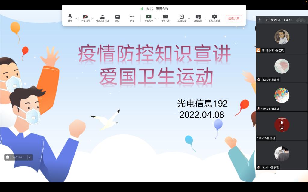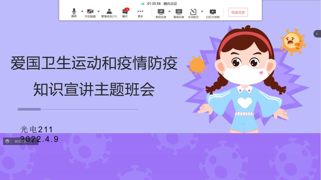 按照《关于莲湖校区员工公寓驻楼工作专班后续有关工作的通知》,2022年4月6日至4月10日,英国上市公司365各班级陆续召开了“爱国卫生运动及疫情防疫知识宣讲”线上主题班会。