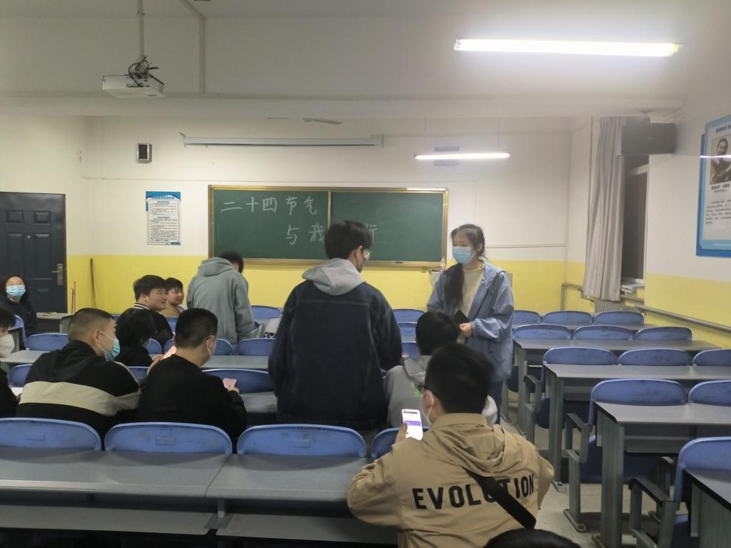 活动伊始,姜子娟向大家介绍了二十四节气对人们生产生活的重要性并简单介绍了本次活动的活动流程。随后,姜子娟通过小游戏向同学们提问有关二十四节气的相关诗词和词谜,大家积极发言,踊跃回答,现场气氛轻松活跃。主持人热情引导参会人员发言,肯定大家的答案,纠正错误回答。同时讲述了一些自己对于二十四节气的理解,同学们沉浸其中。活动结束之后,主持人对本次活动进行了总结并给积极参加活动的同学们赠送精美小礼品,本次活动在同学们的欢声笑语中圆满结束。