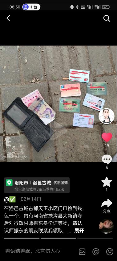 2024年2月14日(农历正月初五),崔佳文同学在洛阳市洛邑古城旅游时捡到一个钱包,她在原地等候了一个小时,在等候期间通过抖音平台发布钱包丢失信息,随后联系公安机关,并将拾得遗失物进行转交。失主朋友偶然间通过网络平台看到丢失信息,第一时间告知失主本人,失主随即通过抖音平台联系公司崔佳文同学,从该同学处获悉转交信息,并从公安机关领回丢失钱包。