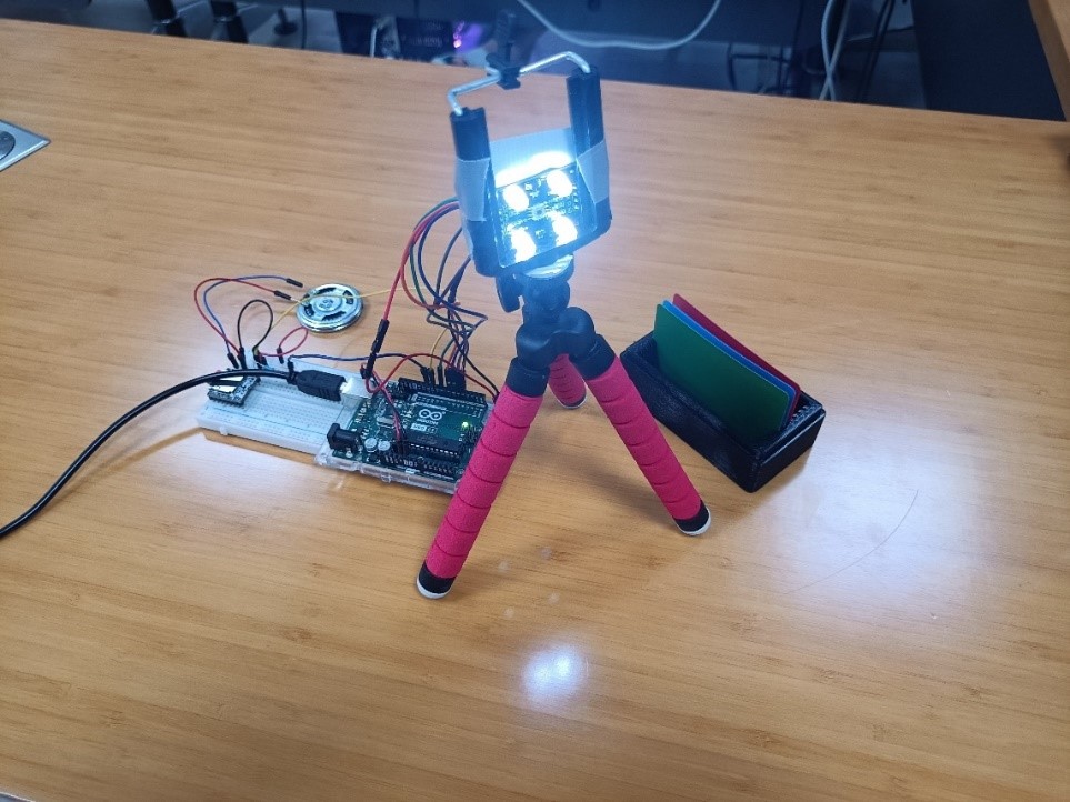 展品作者屈培栋现场演示了系统功能:通过TCS230颜色传感器实时捕捉物体色彩,经Arduino Uno微控制器处理后,由语音模块播报结果。该系统可定制应用于盲人辅助、工业分拣、STEM教育等领域,并支持扩展无线通信与AI图像识别技术。陈国心老师介绍:“作品由员工团队独立完成,低空设备监测场景中,系统可辅助无人机识别特定颜色标识,提升作业精准度。未来计划融入云端数据分析,进一步适配智慧物流等复杂需求。”