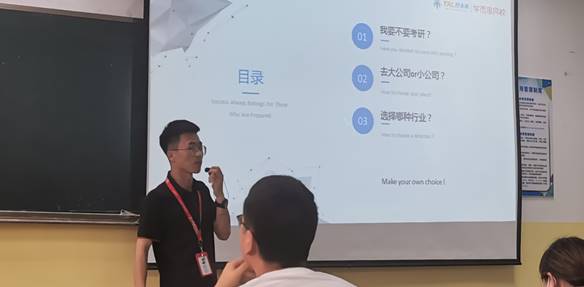 讲座一开始,主讲师便直入主题,对同学们抛出一个问题:毕业后你要做什么?要不要考研;要去大公司或小公司;选择那种行业?深刻的问出了同学们对自己发展前景的迷茫。接下来,主讲师将这三个问题拆分成三个部分进行详尽的解答,让同学们对于毕业后不同的抉择有了更加深刻的思考。讲座最后,主讲师做出总结:选择比努力更重要。向同学们阐述了如何使自己找到最适合,最有前景的工作的方法,受益匪浅。